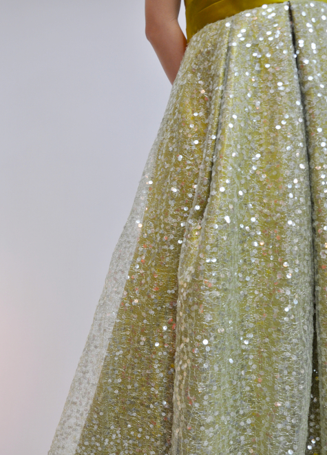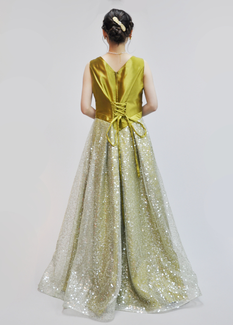 ・ウエストに斜め切り替えライン、スカートのタックが入っているのでウエストから裾にかけてAラインに広がります。スパンコール生地使用。