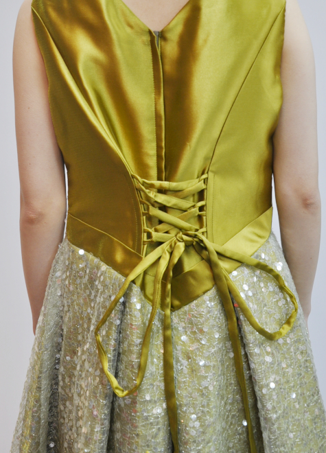 ・ウエストに斜め切り替えライン、スカートのタックが入っているのでウエストから裾にかけてAラインに広がります。スパンコール生地使用。