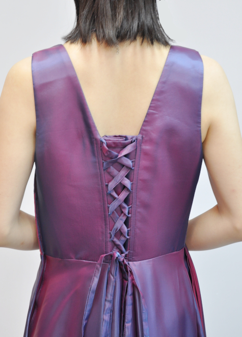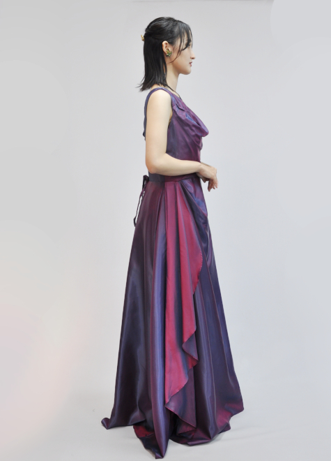胸元のカシュクール風加工、ウエストライン強調、スカート右サイドにドレープデザインを施すことで