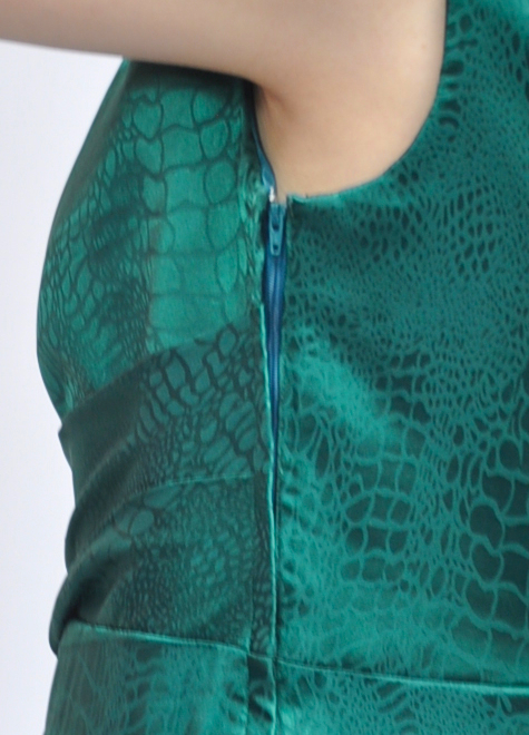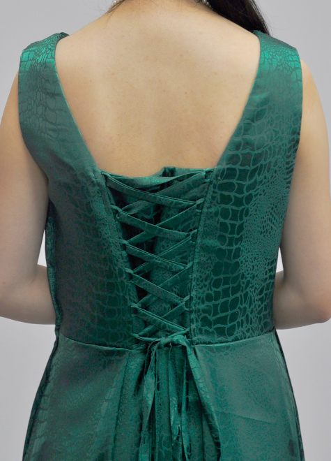 胸元のカシュクール風加工、ウエストライン強調、スカート右サイドにドレープデザインを施すことで