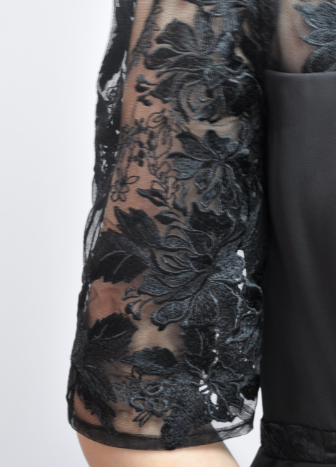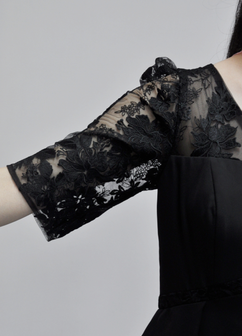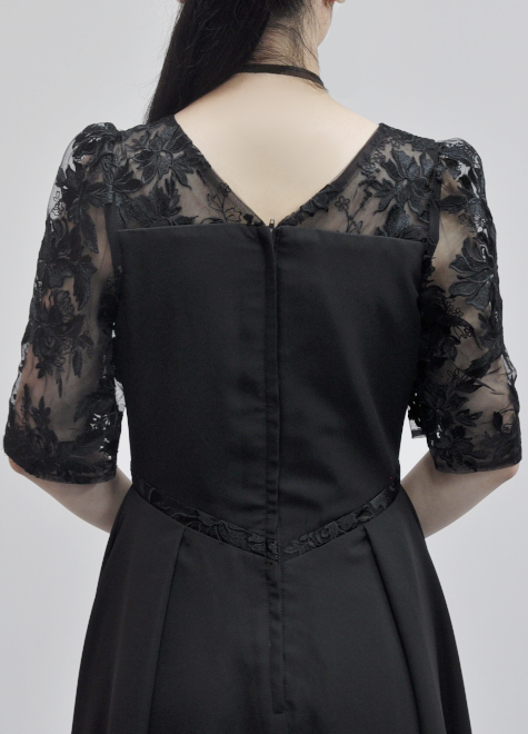 ハイウエストのすっきりした切替が袖付のやぼったい感じを忘れさせてくれます。スカートの分量もたっぷりあり、年齢問わず品よく着ていただけるレース黒ドレスです。