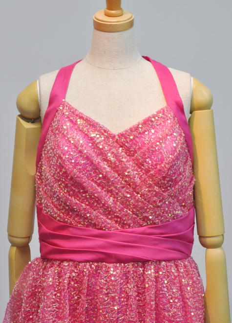 ・生地は輝きやツヤ感を出すためにスパンコール用の糸を編み込んでいるので、スパンコール落ちの心配もなく照明や見る角度によって美しい輝きステージ映えするデザイン