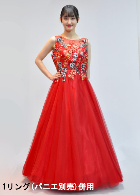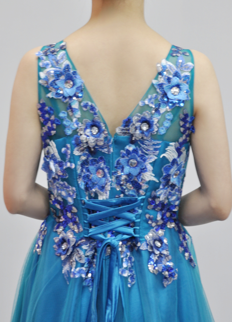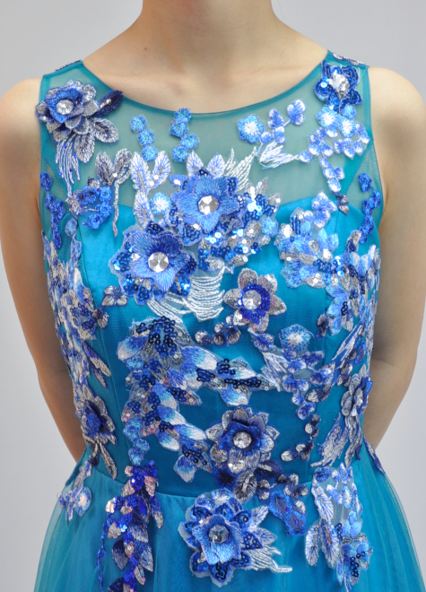 ・身頃には、ラメ糸を混ぜた立体的なフラワー柄刺繍のAラインドレス