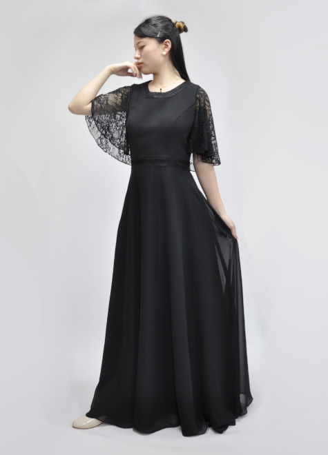 【セミオーダー】演奏会用ロング黒ドレス袖付きs1773-bk